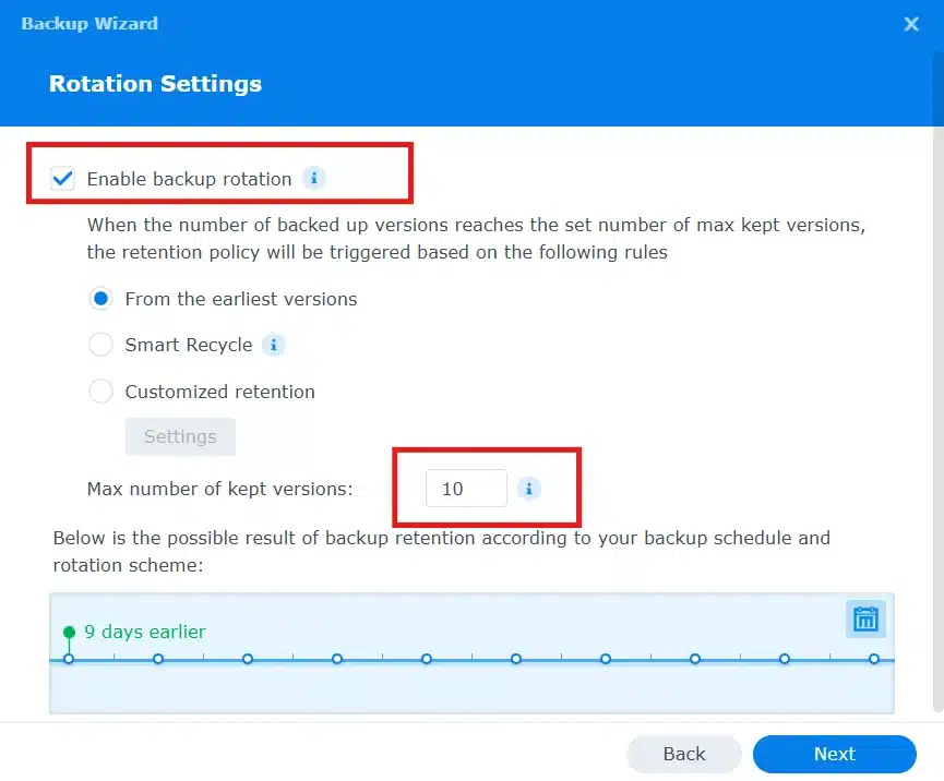 Here you can choose to enable the Backup Rotation, and choose how many versions of the backup you would like to keep:
